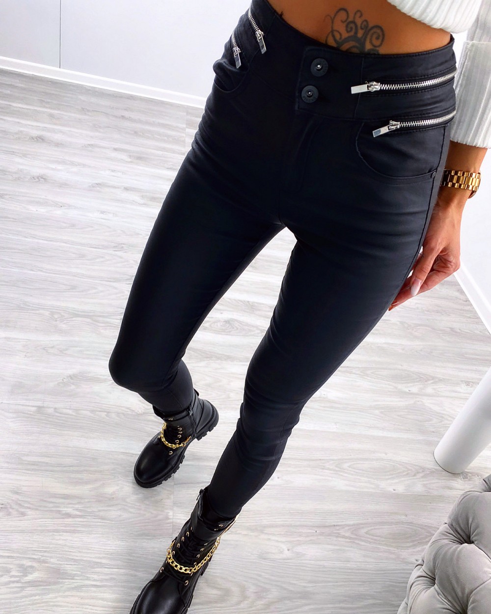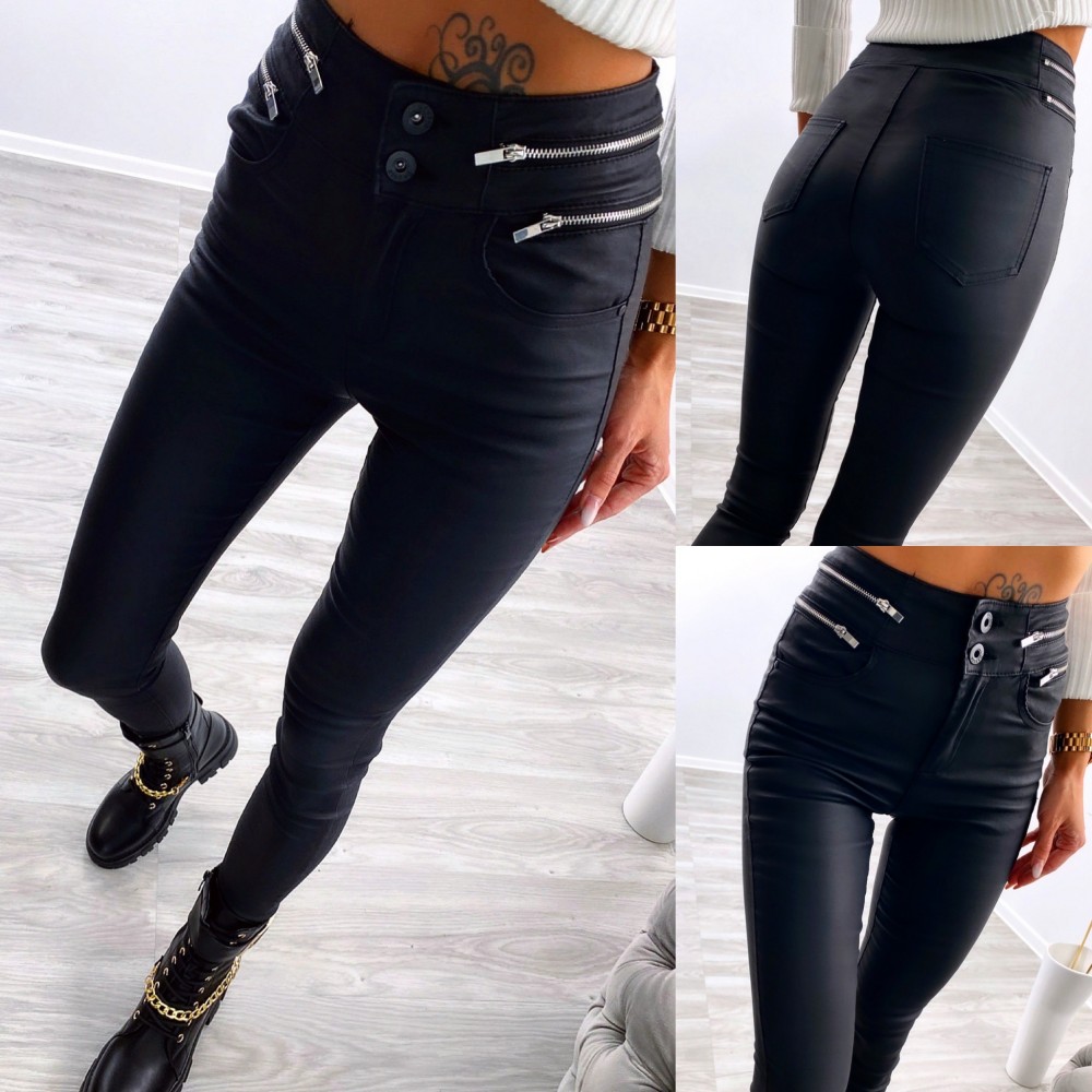 Matētas ādas elastīgas bikses ar sudraba rāvējslēdzējiem (Melns, XS)